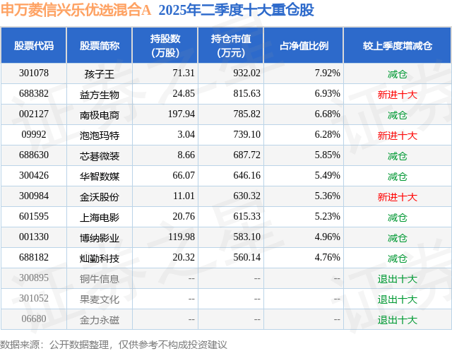 根据2025基金半年报公募基金重仓股数据,重仓该股的公募基金共1家,其中持有数量最多的公募基金为申万菱信基金的申万菱信兴乐优选混合A。申万菱信兴乐优选混合A目前规模为0.53亿元,最新净值1.2691(9月30日),较上一交易日下跌0.71%,近一年上涨54.84%。该公募基金现任基金经理为付娟。付娟在任的基金产品包括:申万菱信新经济混合A,管理时间为2020年9月21日至今,期间收益率为50.06%;申万菱信乐享混合A,管理时间为2021年3月24日至今,期间收益率为32.29%;申万菱信乐同混合A,管理时间为2021年9月6日至今,期间收益率为-13.2%;申万菱信乐融一年持有混合A,管理时间为2022年6月17日至今,期间收益率为44.98%。