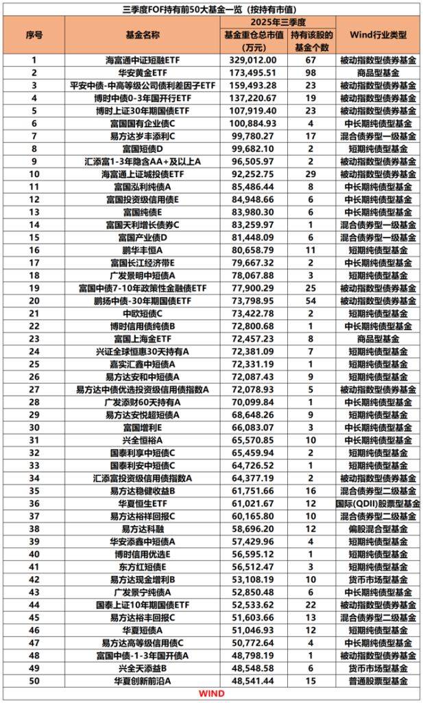 Wind数据显示,公募FOF三季度末重仓的前50大基金中,债券型基金仍是FOF重仓“主力军”,数量达31只,占比过半。同时,伴随指数投资时代加速到来,被动指数型产品也成为FOF重仓基金。