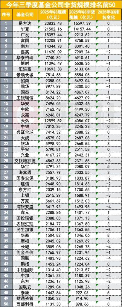 先看非货管理规模第一梯队:易方达、华夏、广发、富国、南方、嘉实、华泰柏瑞、博时、汇添富、景顺长城位列前十。