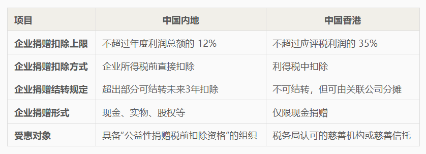 相比之下,香港的捐赠扣除比例较高,且与个人捐赠享受相同的额度待遇。不过,香港的捐赠扣除不可跨年结转,但企业可以通过关联公司进行分摊抵扣。需要注意的是,香港的捐赠形式仅限于现金,股权捐赠和实物捐赠均无法享受税务减免优惠。