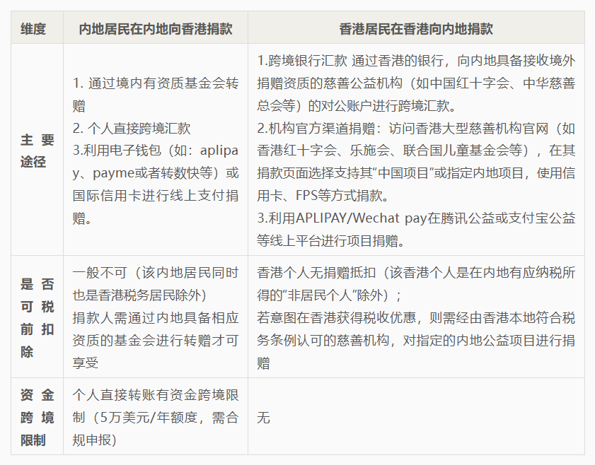 在税务安排方面,非香港税务居民的内地捐款人若直接向香港慈善机构捐款,将无法享受香港税法下的慈善捐赠税收优惠或内地税法下的公益性捐赠税前扣除待遇。
