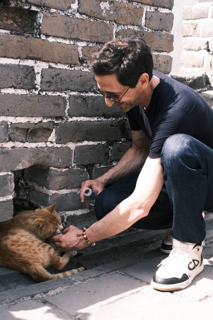 第二天,布劳迪一行早早出发去爬慕田峪长城。这里不仅以壮美的北地风光取胜,也以栖息着众多“长城喵”闻名。面对傲娇的猫主子,影帝也心甘情愿化身猫奴,先喂水、再按摩。猫咪却依旧矜持,转身藏回城砖洞里继续睡大觉。