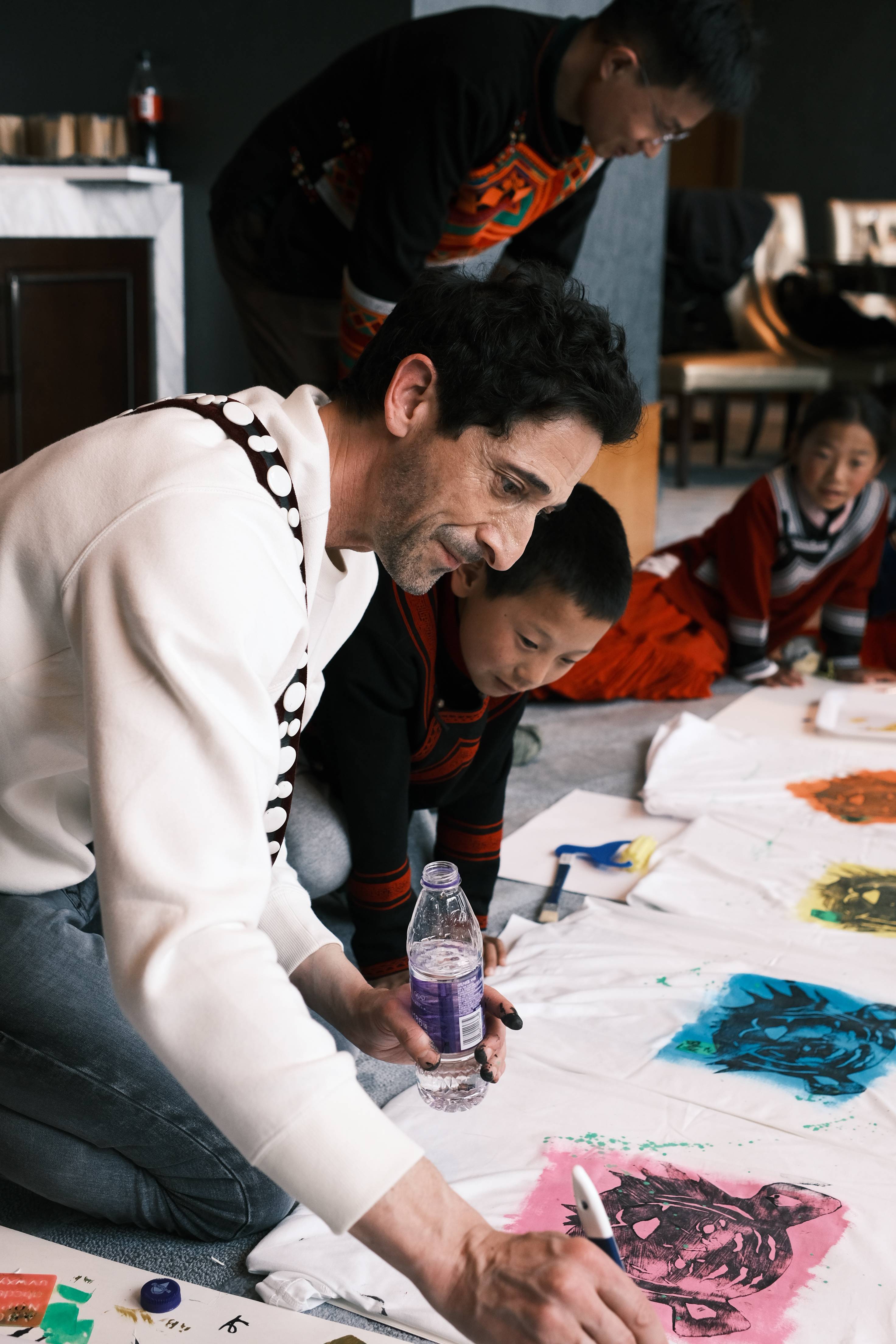 除了工作行程和City Walk,布劳迪在上海还有一个重要的公益使命:应FICFF时尚与可持续未来基金会之约,作为老师为来自四川西南山区的孩子们开设一堂特别的创意绘画课。在课上,布劳迪教授孩子们绘画技巧,并与他们共同创作了几件慈善T恤。他坚信艺术可以跨越语言的隔阂,在不同文化间实现心灵的共鸣。