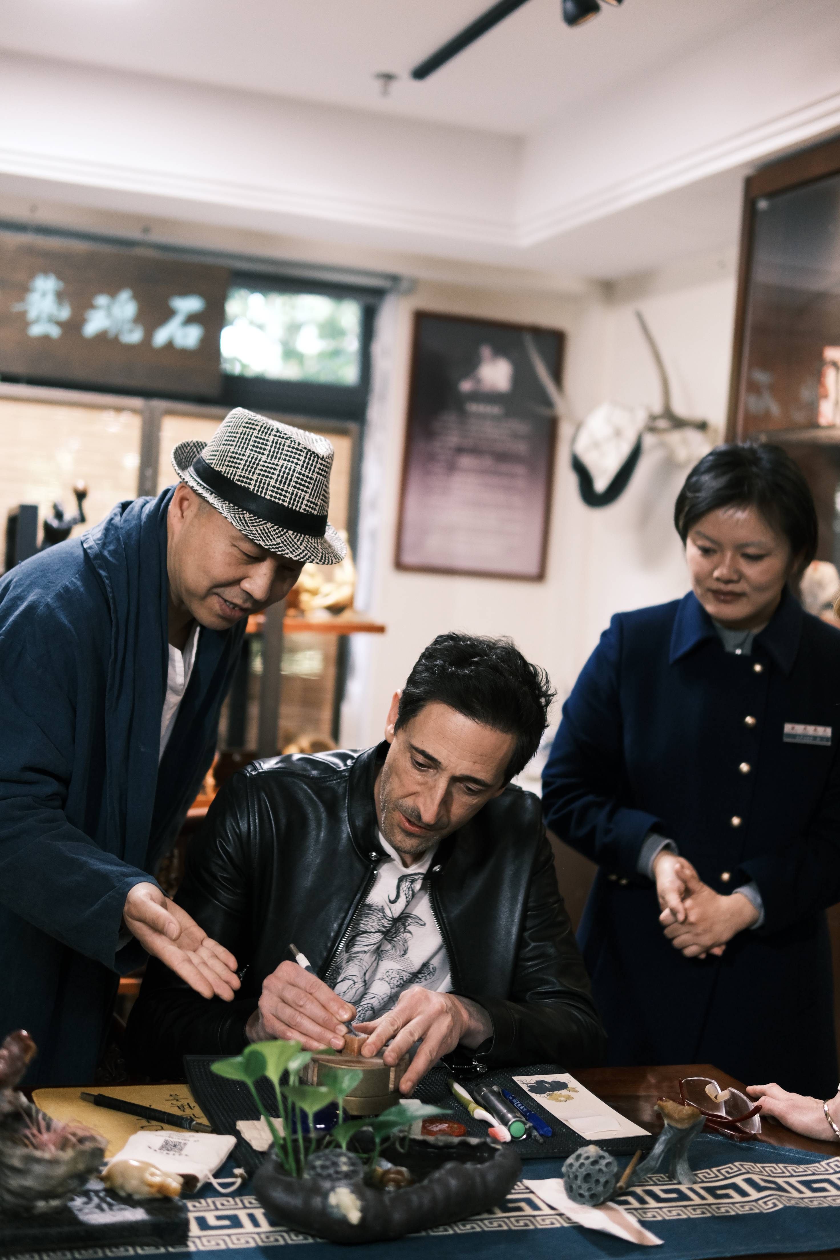 布劳迪一行第一站来到杭州工艺美术博物馆,近距离欣赏本地手工艺非遗项目。篆刻、木雕、风筝、扇面、双面刺绣……精彩技艺牢牢吸引了来宾的目光。在篆刻传承人的指导下,身着龙纹刺绣夹克的布劳迪亲自拿起刻刀,为写有他中文名“阿德里安”的印章刻下最后一笔。这枚葫芦形的印章寓意“福禄”,饱含了杭州对这位天才艺术家的美好祝福。身为著名时尚设计师,布劳迪女友乔治娜·查普曼的创作深受中国文化的感染和启发,意犹未尽的她随后又转道临近的手工艺活态馆继续参观。