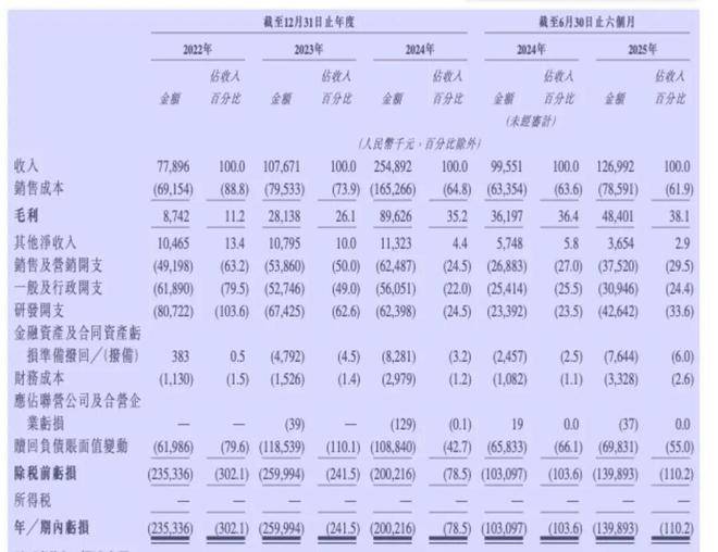 报告期内(2022年至2024年及2025年上半年),公司营收一路攀升,分别为7789.6万元、1.08亿元、2.55亿元和1.27亿元;但净利润却持续深陷亏损,分别达到2.35亿元、2.59亿元、2.00亿元和1.39亿元。这意味着,尽管营收在两年半内增长了两倍多,亏损的幅度却未见明显收窄。