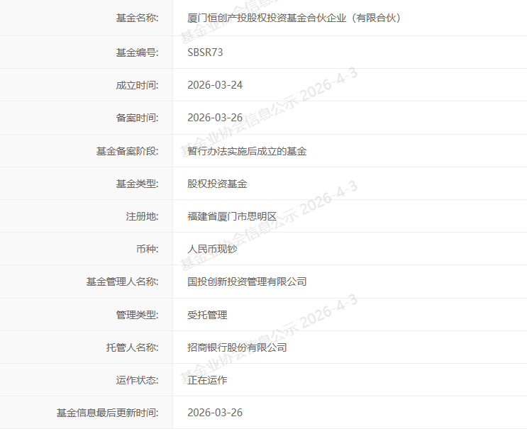2026-04-06多宝体育,多宝体育官方网站,多宝体育APP下载近日,由国投创新投资管理有限公司发起设立的厦门恒创产投股权投资基金合伙企业(有限合伙)在中国证券投资基金业协会完成备案。目前该基金已完成首关,由国投创新与厦门产投新圆科技投资有限公司作为双普通合伙人共同管理,体现了央企与地方平台在市场化基金运作方面的深度协同。