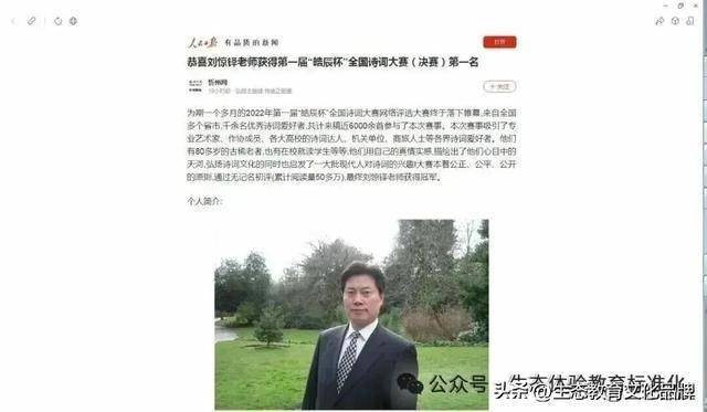 上图为:《人民日报》报道,诗人教育家刘惊铎的获奖诗(词)《生态体验》《沁园春·革命伴侣民族魂》蝉联全国诗词大赛冠军。《生态体验诗》视频由江苏“四名人才”著名主持人、扬州广电总台和音乐频率总监、正高级播音指导石翔倾情朗诵。(图片来源:人民日报、中国报道、国开之声)