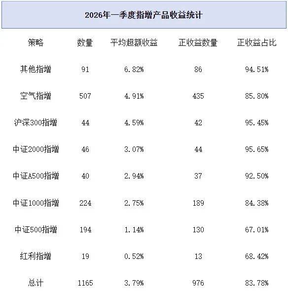 私募排排网数据显示,今年一季度纳入统计的1165只指数增强私募基金平均超额收益为3.79%,实现正超额收益的产品为976只,占比达83.78%。