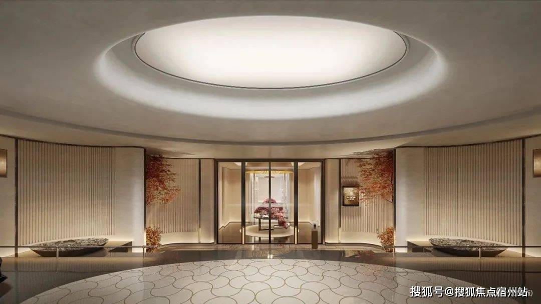 本项目基座局部石材,主体墙面玻璃、香槟金及灰色铝板配以高品质暖灰涂料,塑造现代雅致的立面风格形象。2、约32米气派门厅,归家尽享尊崇感