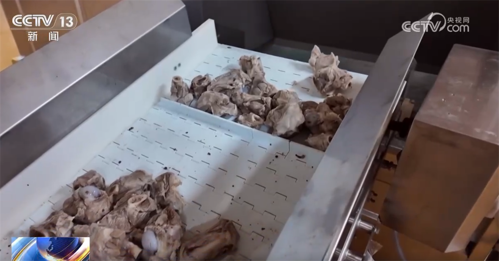 在海南洋浦的一家肉类加工企业,源源不断的骨头传送到生产线上进入加工环节。企业负责人刘鹏告诉记者,因为订单大幅增加,就连刚刚过去的新年,他们都在加紧生产。
