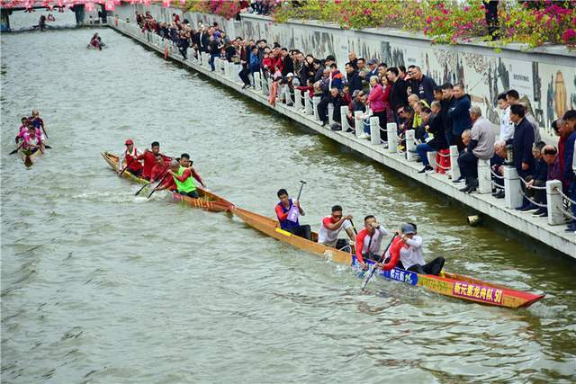 虽已是早春时节,又恰逢新春初一,气温有所下降,但紫南村处处洋溢着火热的激情。下午1时半,随着一声清脆的倒计时,早已蓄势待发的45条龙舟如离弦之箭,在紫南村的龙舟赛道里劈波斩浪。