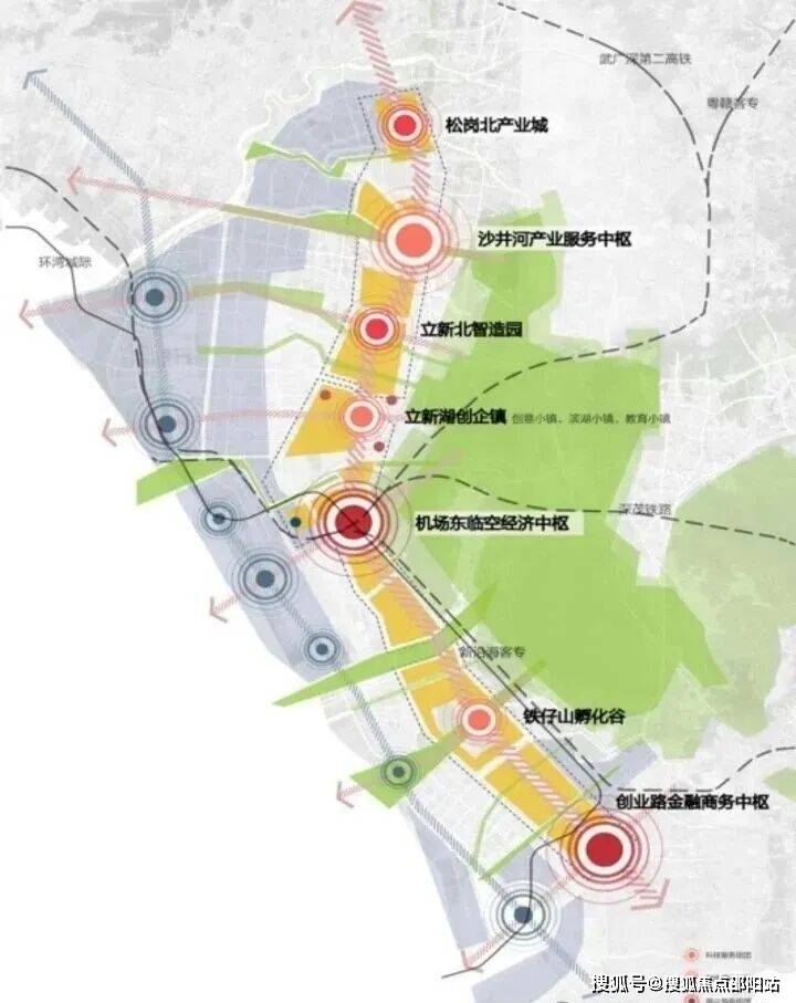 空铁新城机场东综合交通枢纽作为深圳建设国际航空枢纽与国家铁路枢纽的重要组成部分,集航空、高铁、城际、城市轨道、公交等多种交通方式于一体。目依托自身的交通优势。左连前海、右接会展。享受前海的金融利好辐射,又承载着会展的人流导入的功能。成是湾区三角中金融辐射、会展人流承载的核心地带