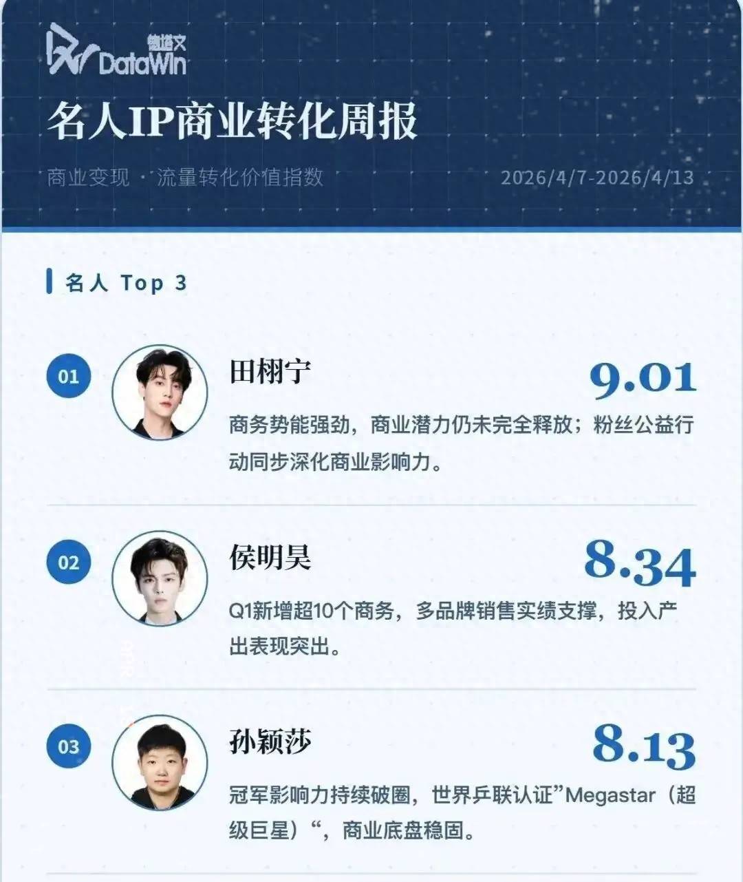 2026-04-22多宝体育,多宝体育官方网站,多宝体育APP下载德塔文(DataWin)刚刚公布了2026年4月7日至4月13日的《名人IP商业转化周报》,孙颖莎以8.13分的高分位列第三,前两名分别是青年演员田栩宁的9.01分和侯明昊的8.34分。这份榜单平时基本被娱乐圈明星霸占,现在突然杀进来一个乒乓球运动员,这含金量不用多说了吧?更牛的是,孙颖莎是这个榜单Top3里唯一的体育明星,连成毅、张凌赫、迪丽热巴这些娱乐圈顶流都被她压在了身后。